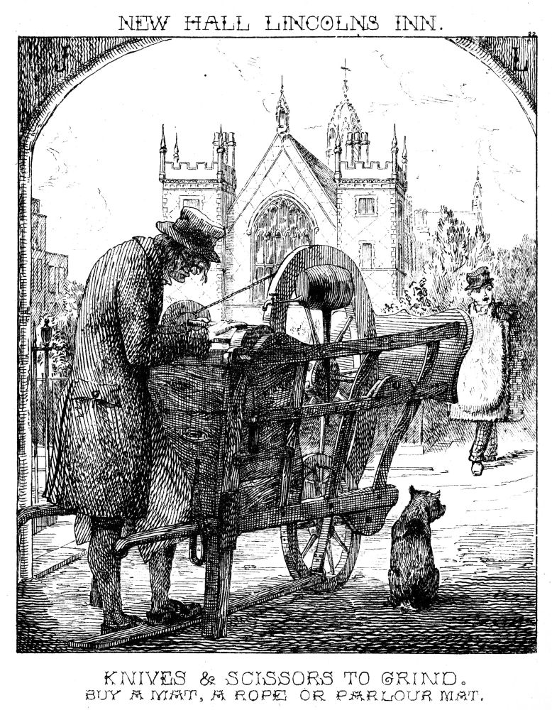 We here have a grinder executing a job under the entrance gateway to New Square, Lincoln’s Inn; who, if we may judge from the smile of satisfaction playing on his countenance, has had merry work amongst the cleavers of Clare Market, adjacent. Hoping he may find the like success with the pen-knives of the lawyers of Lincoln’s Inn, we wish him “Good day!”