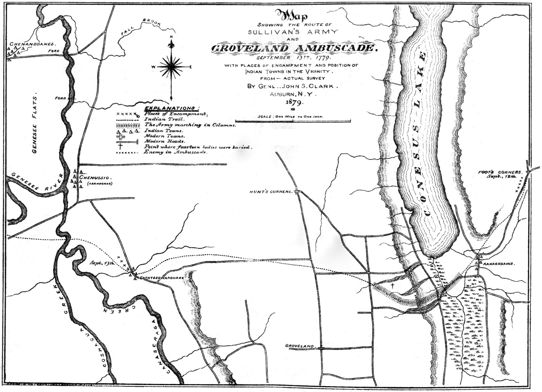 The route covered by the Journal, begins at Wawarsing, in Ulster County, New York, passing south-westerly along the Mine road and Delaware river to Stroudsburg, Penn.; thence westerly over the mountains, by the Sullivan road to Wilkesbarre; thence up the Susquehanna river to Tioga Point near present Athens, where General Clinton's brigade on August 22d, joined the main army; thence up the Chemung river to present Elmira, and northerly to Havana; thence along the east shore of Seneca lake to present Geneva, and by way of Canandaigua, Honeoye, and Conesus to the Genesee river near present Cuylerville, in Livingston county, where was found the great Seneca town of Chenandoanes, or Genesee Castle, the most westerly point reached by the expedition.