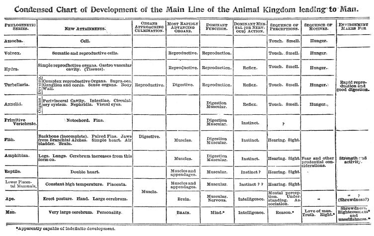 Now, the sequence of dominant functions or aims in life can be traced with far more ease and safety, not to say certainty, than one of anatomical details. The latter characterize small groups, genera, families, or classes; while the dominant function characterizes all animals[xii] of a given grade, even those which through degeneration have reverted to this grade.