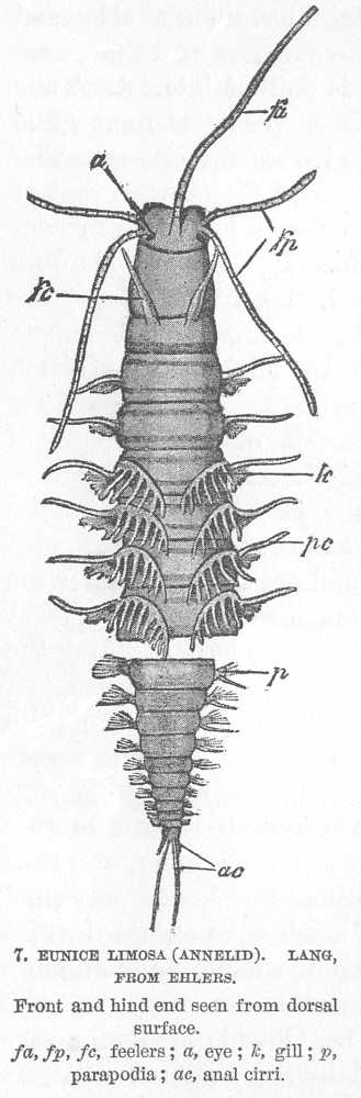 | Worms and the development of organs. — Mollusks: The external protective skeleton leads to degeneration or stagnation. — Annelids and arthropods: The external locomotive skeleton leads to temporary rapid advance, but fails of the goal. — Its disadvantages. — Vertebrates: The internal locomotive skeleton leads to backbone and brain. — Reasons for their dominance. — The primitive vertebrate. | |