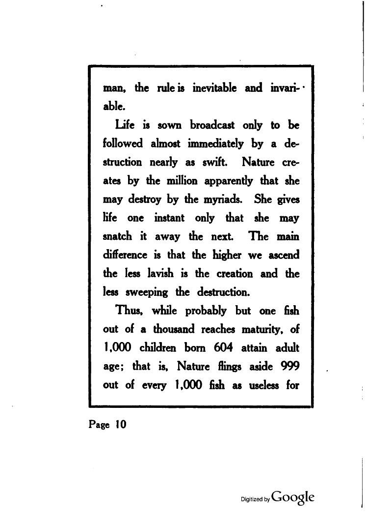 Thus, while probably but one fish out of a thousand reaches maturity, of 1,000 children born 604 attain adult age; that is, Nature flings aside 999 out of every 1,000 fish as useless for {10} her purposes, and two out of every five human beings.