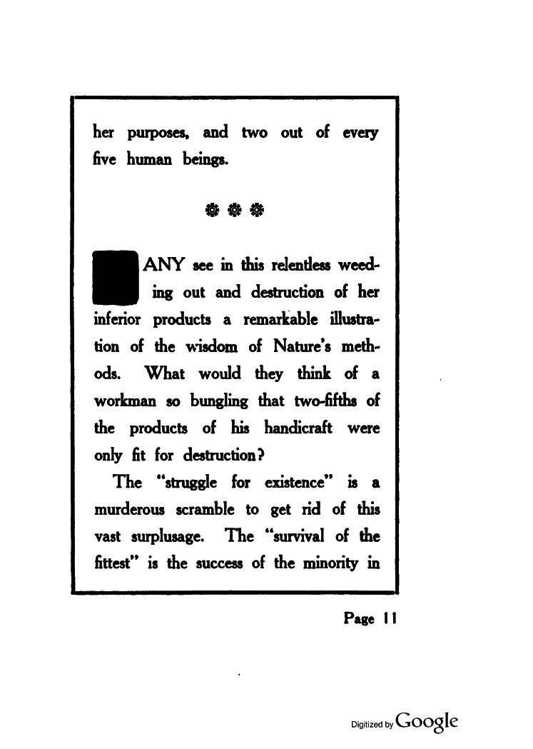 If, too, every child had the same chance of life without reference to its mental and physical fitness to live, humanity would soon become a stagnant slough of vicious vitality. There are only food and room for the best, and as the development of the race demands {15} it, only the best survive and continue the work of propagation. The rest are destroyed.