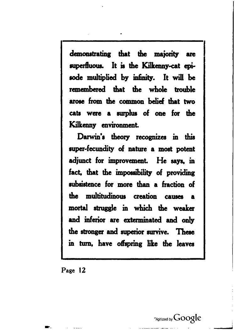 The “struggle for existence” is a murderous scramble to get rid of this vast surplusage. The “survival of the fittest” is the success of the minority in {11} demonstrating that the majority are superfluous. It is the Kilkenny-cat episode multiplied by infinity. It will be remembered that the whole trouble arose from the common belief that two cats were a surplus of one for the Kilkenny environment.