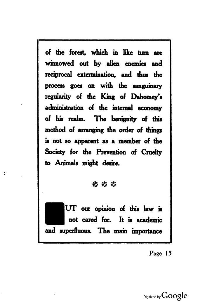 Darwin’s theory recognizes in this super-fecundity of nature a most potent adjunct for improvement He says, in fact, that the impossibility of providing subsistence for more than a fraction of the multitudinous creation causes a mortal struggle in which the weaker and inferior are exterminated and only the stronger and superior survive. These in turn, have offspring like the leaves {12} of the forest, which in like turn are winnowed out by alien enemies and reciprocal extermination, and thus the process goes on with the sanguinary regularity of the King of Dahomey’s administration of the internal economy of his realm. The benignity of this method of arranging the order of things is not so apparent as a member of the Society for the Prevention of Cruelty to Animals might desire.