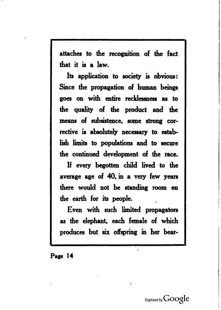Its application to society is obvious: Since the propagation of human beings goes on with entire recklessness as to the quality of the product and the means of subsistence, some strong corrective is absolutely necessary to establish limits to populations and to secure the continued development of the race.