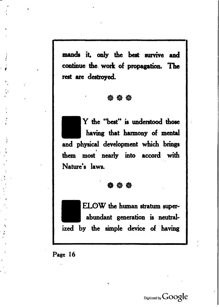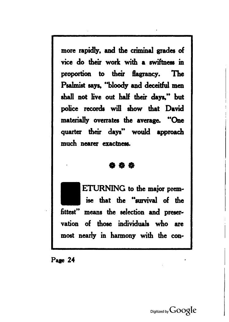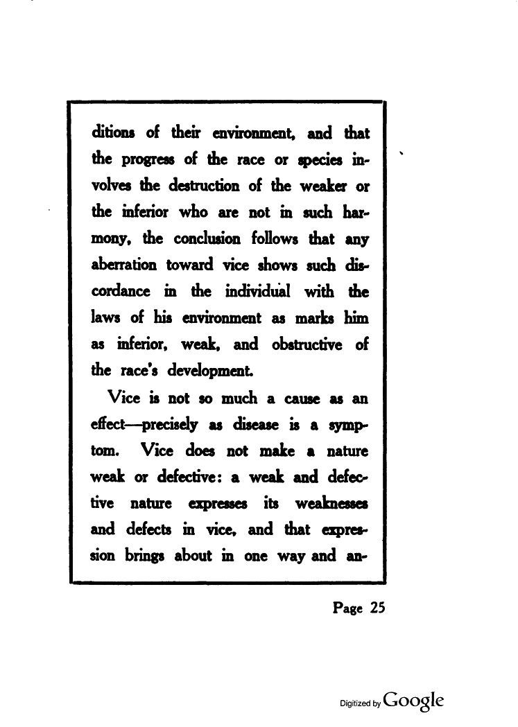 RETURNING to the major premise that the “survival of the fittest” means the selection and preservation of those individuals who are most nearly in harmony with the conditions {24} of their environment, and that the progress of the race or species involves the destruction of the weaker or the inferior who are not in such harmony, the conclusion follows that any aberration toward vice shows such discordance in the individual with the laws of his environment as marks him as inferior, weak, and obstructive of the race’s development