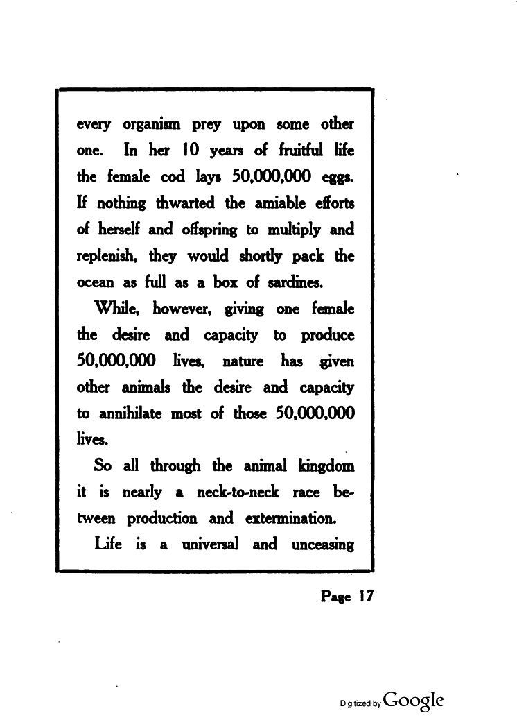 While, however, giving one female the desire and capacity to produce 50,000,000 lives, nature has given other animals the desire and capacity to annihilate most of those 50,000,000 lives.