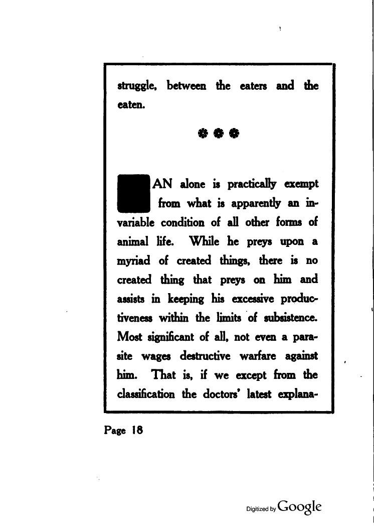 condition of all other forms of animal life. While he preys upon a myriad of created things, there is no created thing that preys on him and assists in keeping his excessive produc tiveness within the limits of subsistence. Most significant of all, not even a parasite wages destructive warfare against him. That is, if we except from the classification the doctors’ latest explanation {18} of the cause of everything, from pneumonia to laziness—the modest but effective bacillus. The bacillus, however, is much more a condition than a parasite.