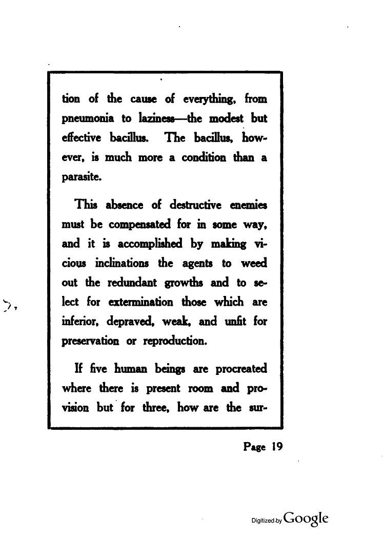 This absence of destructive enemies must be compensated for in some way, and it is accomplished by making vicious inclinations the agents to weed out the redundant growths and to select for extermination those which are inferior, depraved, weak, and unfit for preservation or reproduction.