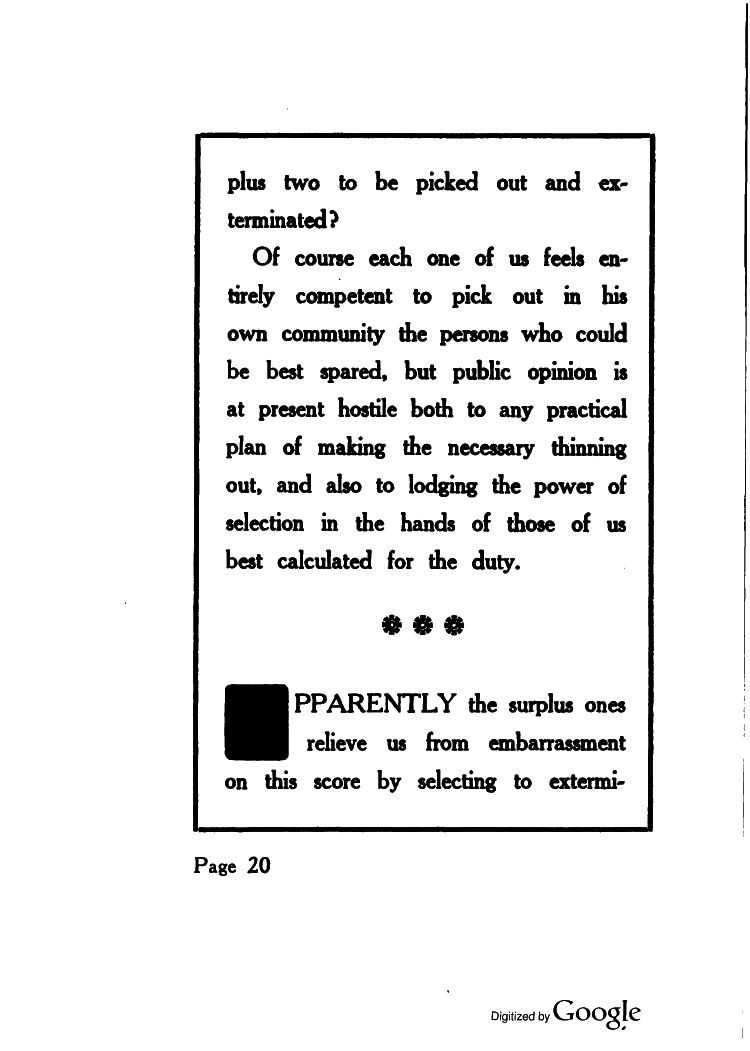APPARENTLY the surplus ones relieve us from embarrassment on this score by selecting to exterminate {20} themselves. Their methods of suicide cover a wide range of expedients but all are very effective.