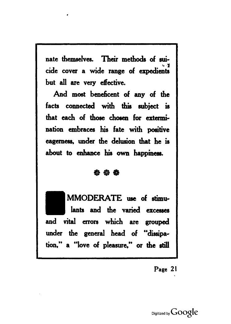 Immoderate use of stimulants and the varied excesses and vital errors which are grouped under the general head of “dissipation,” a “love of pleasure,” or the still {21} more expressive phrase “a short life and a merry one,” etc., are favorite ways of self-annihilation and leave little to be desired in the completeness with which they do their work.
