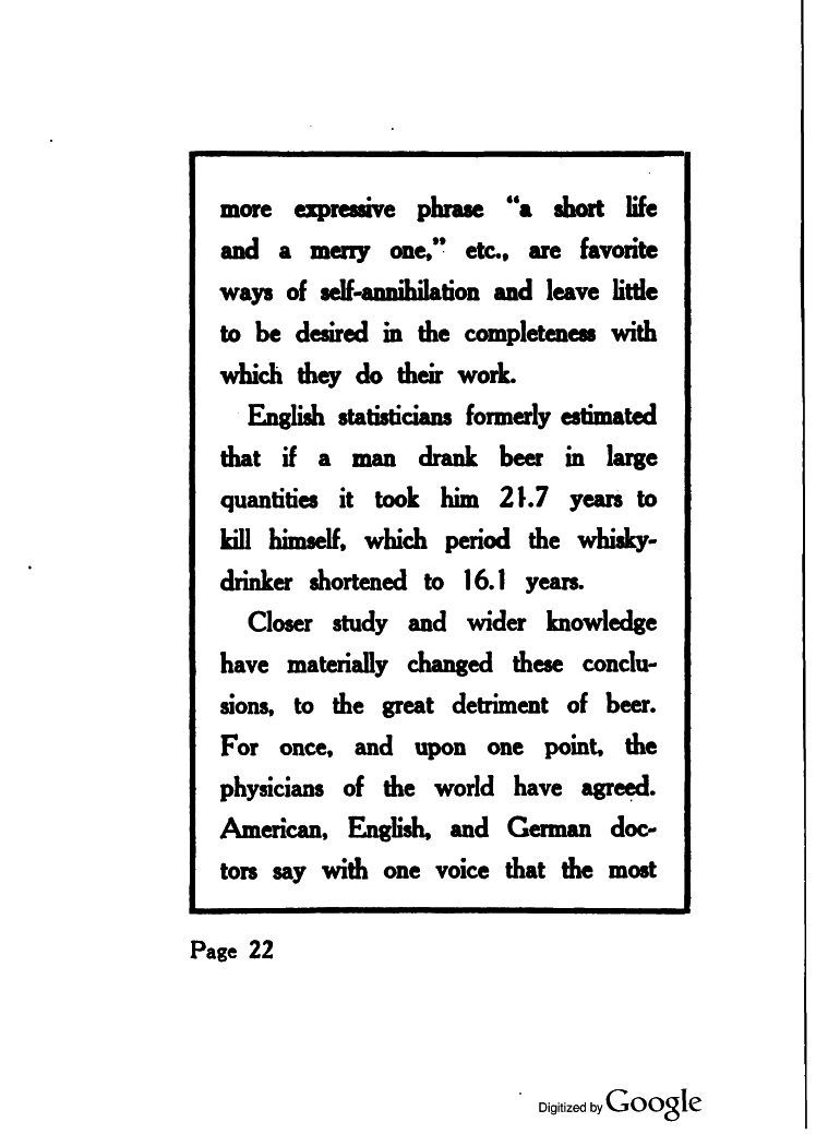 English statisticians formerly estimated that if a man drank beer in large quantities it took him 21.7 years to kill himself, which period the whisky-drinker shortened to 16.1 years.
