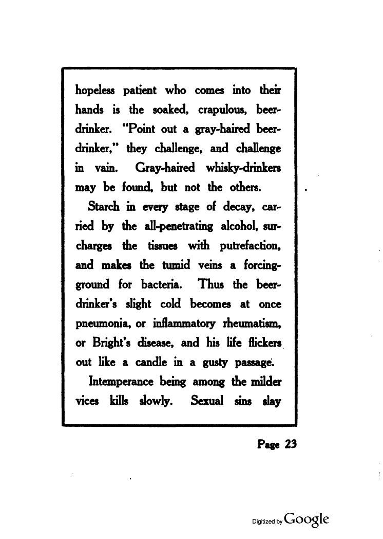 Closer study and wider knowledge have materially changed these conclusions, to the great detriment of beer. For once, and upon one point, the physicians of the world have agreed. American, English, and German doctors say with one voice that the most {22} hopeless patient who comes into their hands is the soaked, crapulous, beer-drinker. “Point out a gray-haired beer-drinker,” they challenge, and challenge in vain. Gray-haired whisky-drinkers may be found, but not the others.