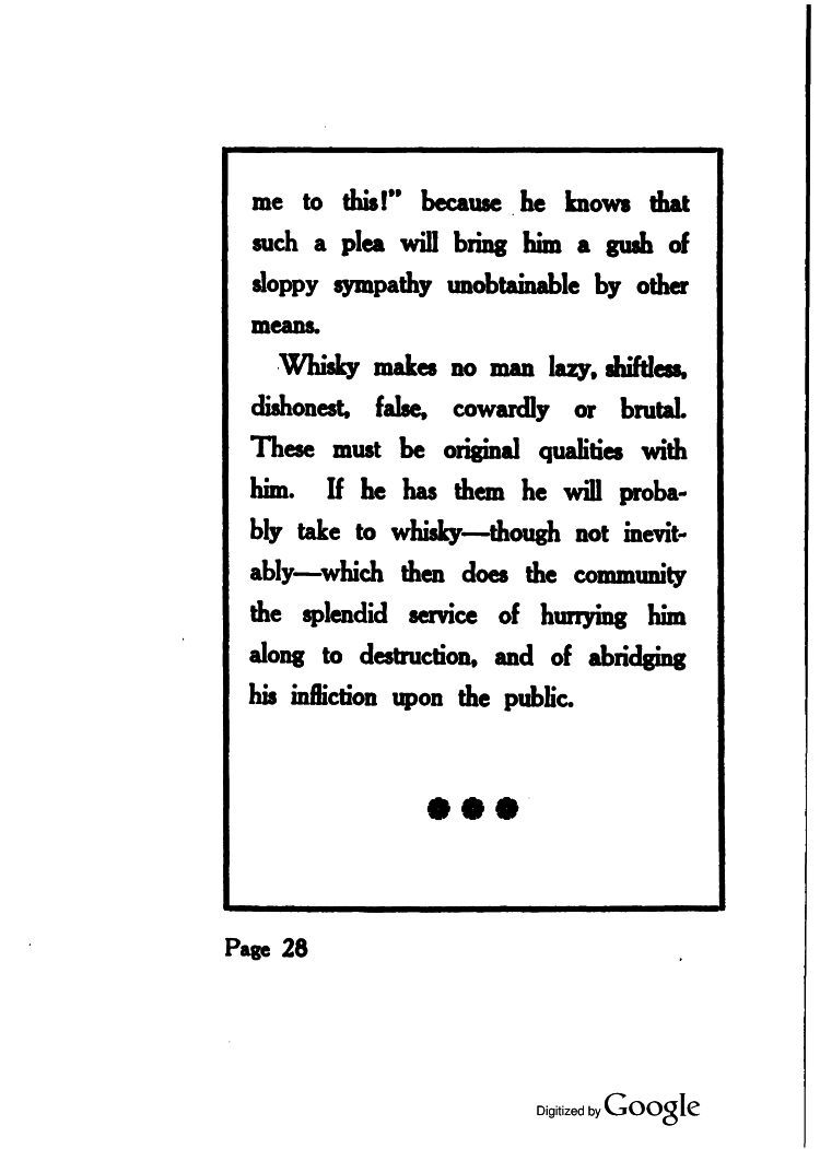 Every man whose sloth or improvidence has brought himself and his family to beggary, every thieving tramp upon the highways, every rascal in the penitentiary, every murderer upon the gallows, hastens to plead “whisky brought {27} me to this!” because he knows that such a plea will bring him a gush of sloppy sympathy unobtainable by other means.