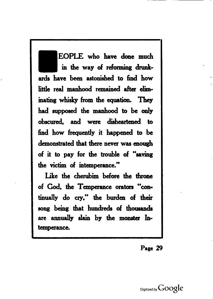 PEOPLE who have done much in the way of reforming drunkards have been astonished to find how little real manhood remained after eliminating whisky from the equation. They had supposed the manhood to be only obscured, and were disheartened to find how frequently it happened to be demonstrated that there never was enough of it to pay for the trouble of “saving the victim of intemperance.” Like the cherubim before the throne of God, the Temperance orators “con- tinually do cry,” the burden of their song being that hundreds of thousands are annually slain by the monster Intemperance. {29} Quite singularly these figures are probably not exaggerated. Myriads of times kindly-hearted physicians write in the death certificate “pneumonia,” “heart-failure,” “diabetes,” etc., when truth demands “beer” or “whisky.”
