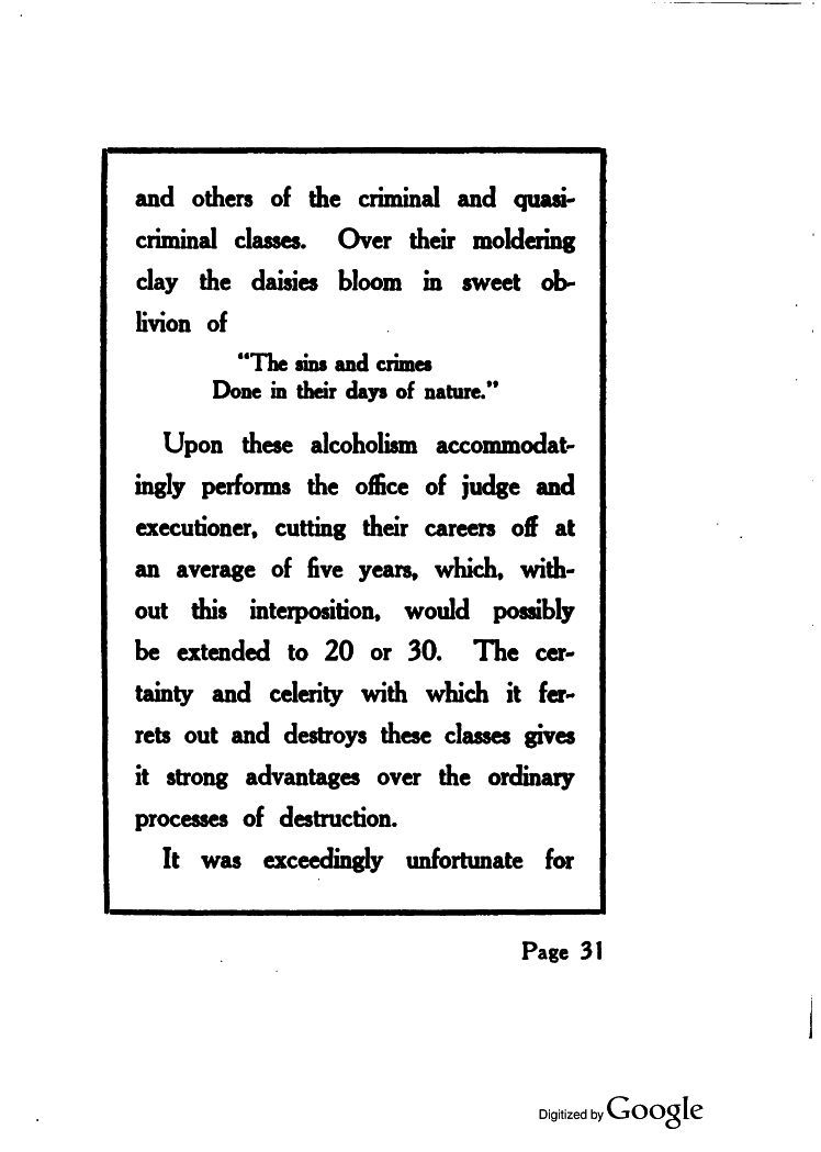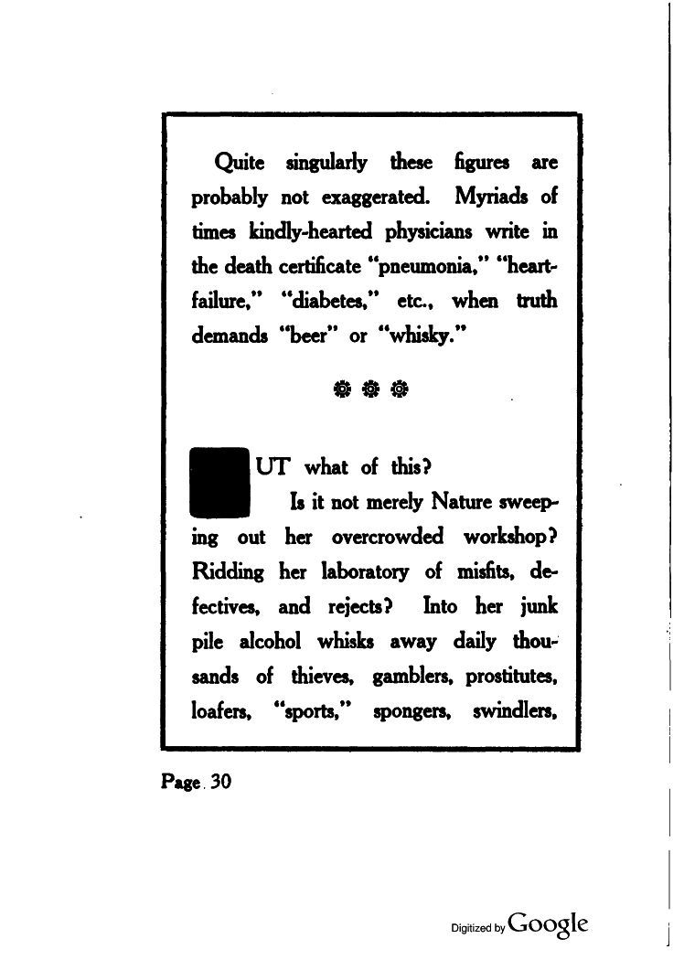 Is it not merely Nature sweeping out her overcrowded workshop? Ridding her laboratory of misfits, defectives, and rejects? Into her junk pile alcohol whisks away daily thousands of thieves, gamblers, prostitutes, loafers, “sports,” spongers, swindlers, {30} and others of the criminal and quasi-criminal classes. Over their moldering clay the daisies bloom in sweet oblivion of