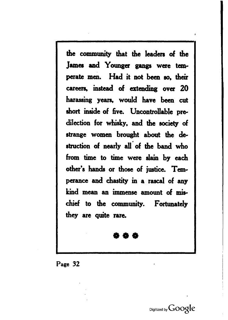 It was exceedingly unfortunate for {31} the community that the leaders of the James and Younger gangs were temperate men. Had it not been so, their careers, instead of extending over 20 harassing years, would have been cut short inside of five. Uncontrollable predilection for whisky, and the society of strange women brought about the destruction of nearly all of the band who from time to time were slain by each other’s hands or those of justice. Temperance and chastity in a rascal of any kind mean an immense amount of mischief to the community. Fortunately they are quite rare. {32} THE rapid spread of Prohibition is full of suggestion. The grain fields of Kansas and Texas are periodically devastated by the green bug. When the green bugs are at their worst a parasite appears which sweeps them off, and the wheat growers have a respite. Then, having destroyed their provender, the parasites starve, and the green bugs have a chance to grow again until the parasites overtake them in the hour of their triumph and power.
