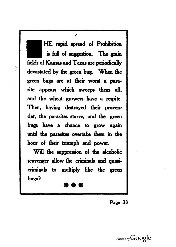 Will the suppression of the alcoholic scavenger allow the criminals and quasi-criminals to multiply like the green bugs? {33}