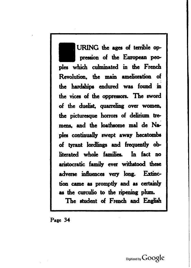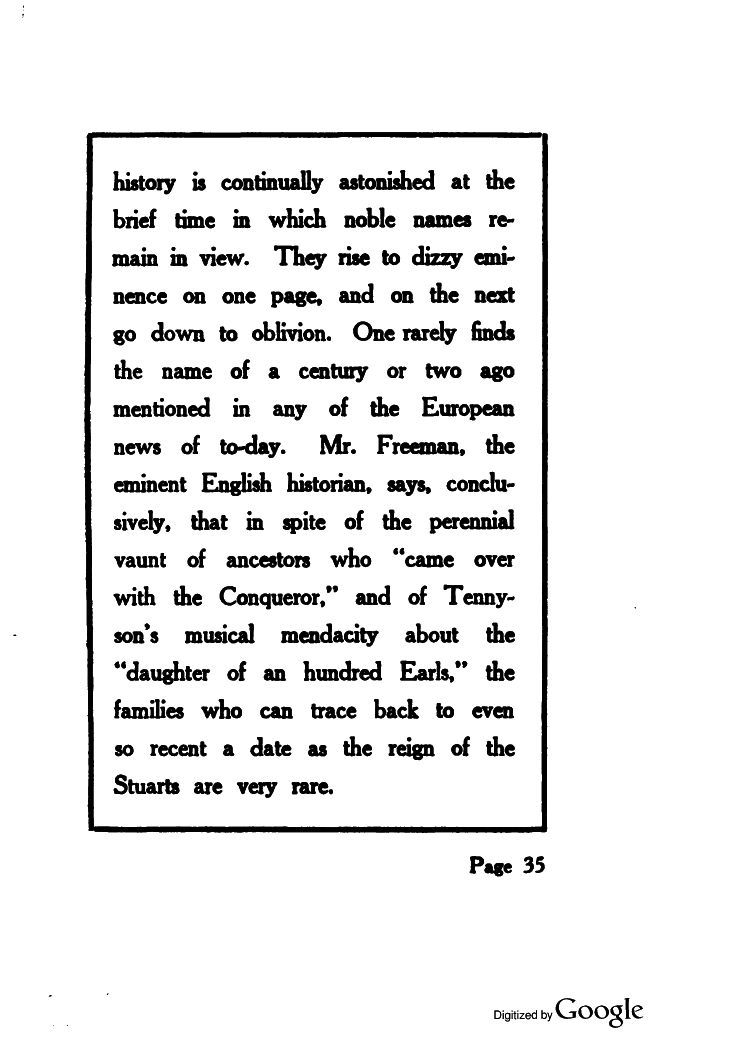 DURING the ages of terrible oppression of the European peoples which culminated in the French Revolution, the main amelioration of the hardships endured was found in the vices of the oppressors. The sword of the duelist, quarreling over women, the picturesque horrors of delirium tremens, and the loathsome mal de Naples continually swept away hecatombs of tyrant lordlings and frequently obliterated whole families. In fact no aristocratic family ever withstood these adverse influences very long. Extinction came as promptly and as certainly as the curculio to the ripening plum. The student of French and English {34} history is continually astonished at the brief time in which noble names remain in view. They rise to dizzy eminence on one page, and on the next go down to oblivion. One rarely finds the name of a century or two ago mentioned in any of the European news of to-day. Mr. Freeman, the eminent English historian, says, conclusively, that in spite of the perennial vaunt of ancestors who “came over with the Conqueror,” and of Tennyson’s musical mendacity about the “daughter of an hundred Earls,” the families who can trace back to even so recent a date as the reign of the Stuarts are very rare. {35} Frequently hundreds of years elapsed before the historic titles were “revived” to gild some parvenu. Since then these families have been kept up only by intermarriages with later parvenus.