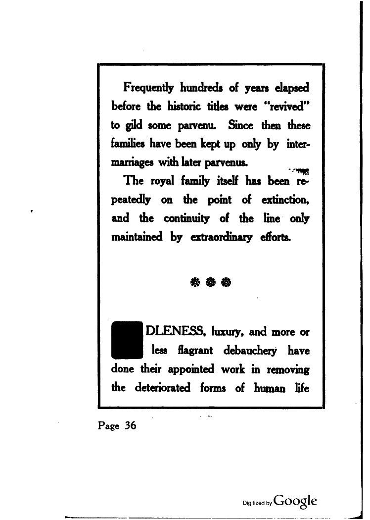 IDLENESS, luxury, and more or less flagrant debauchery have done their appointed work in removing the deteriorated forms of human life {36} from the world, that their room might be had for more acceptable growths.