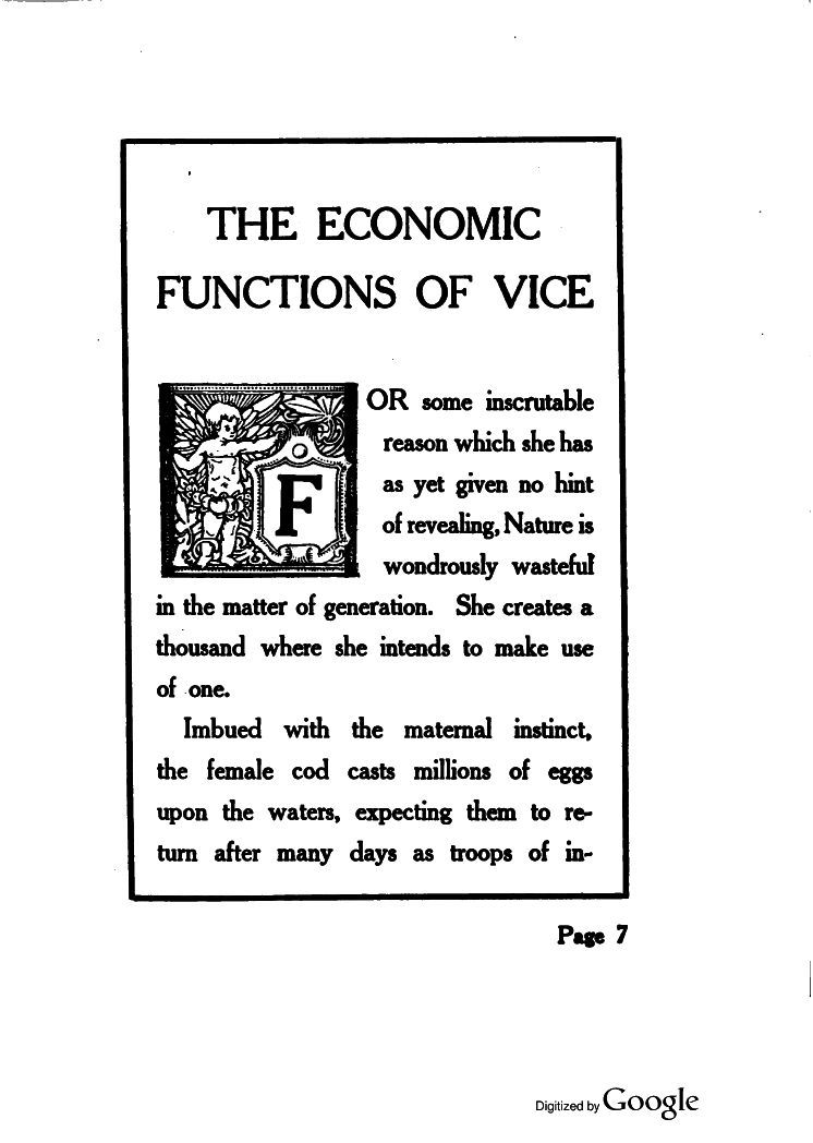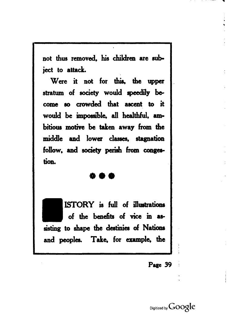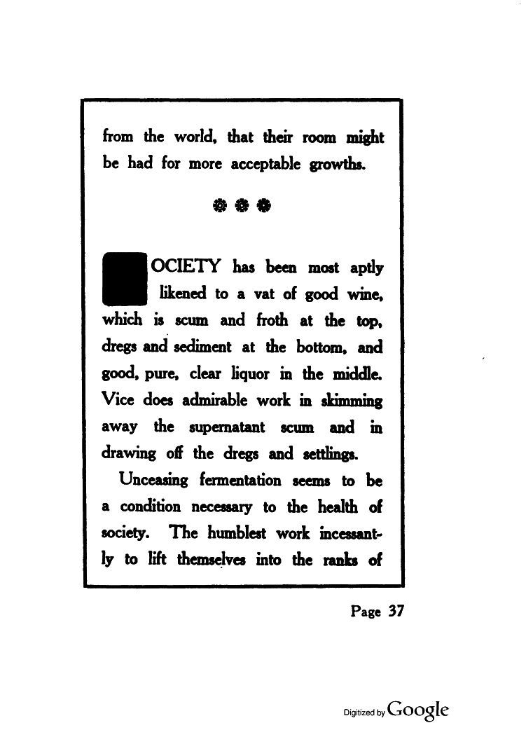 SOCIETY has been most aptly likened to a vat of good wine, which is scum and froth at the top, dregs and sediment at the bottom, and good, pure, clear liquor in the middle. Vice does admirable work in skimming away the supernatant scum and in drawing off the dregs and settlings.