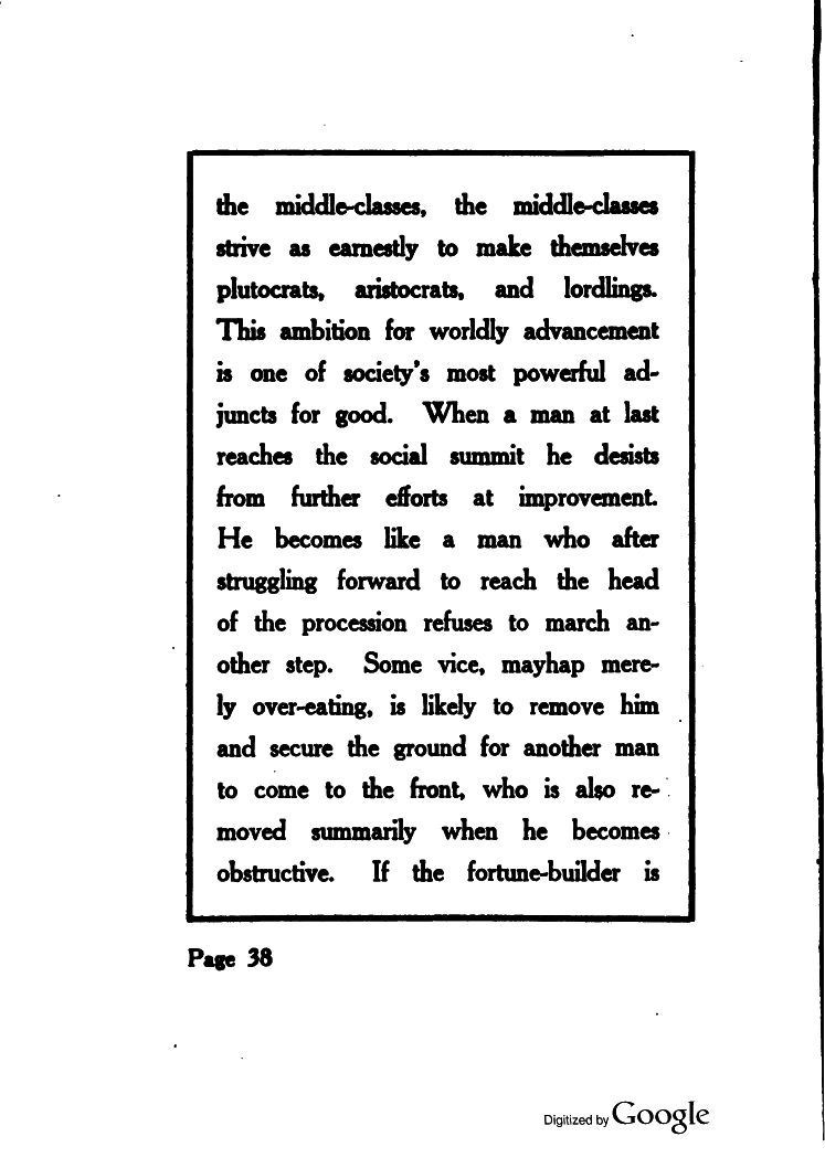 Unceasing fermentation seems to be a condition necessary to the health of society. The humblest work incessantly to lift themselves into the ranks of {37} the middle-classes, the middle-classes strive as earnestly to make themselves plutocrats, aristocrats, and lordlings. This ambition for worldly advancement is one of society’s most powerful adjuncts for good. When a man at last reaches the social summit he desists from further efforts at improvement. He becomes like a man who after struggling forward to reach the head of the procession refuses to march another step. Some vice, mayhap merely over-eating, is likely to remove him and secure the ground for another man to come to the front, who is also removed summarily when he becomes obstructive. If the fortune-builder is {38} not thus removed, his children are subject to attack.