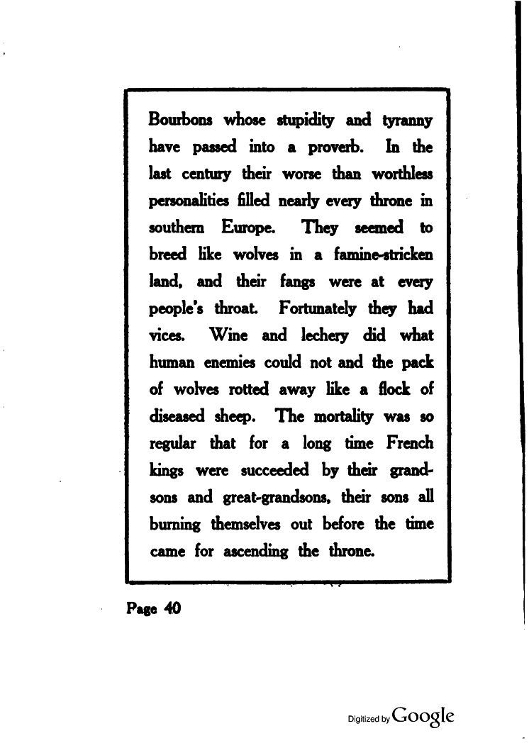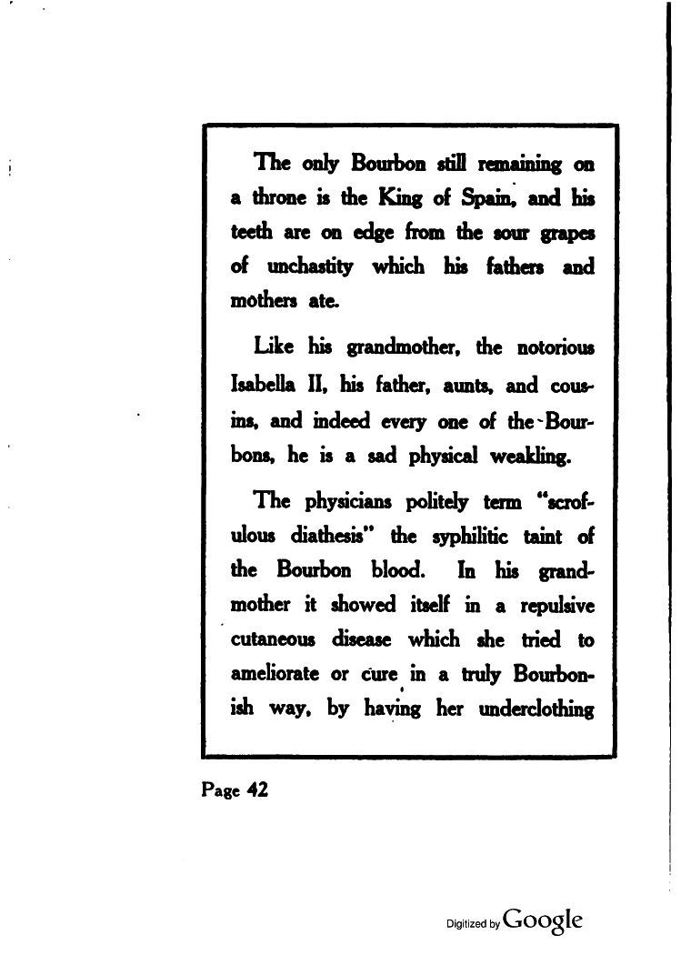 {41} The only Bourbon still remaining on a throne is the King of Spain, and his teeth are on edge from the sour grapes of unchastity which his fathers and mothers ate.