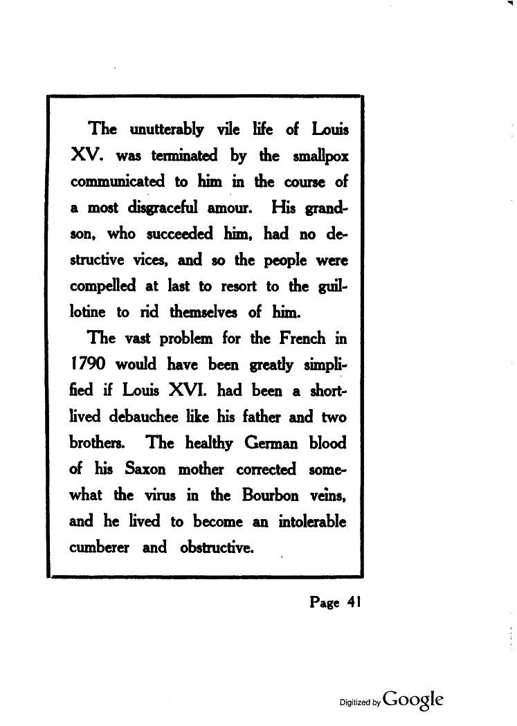 HISTORY is full of illustrations of the benefits of vice in assisting to shape the destinies of Nations and peoples. Take, for example, the {39} Bourbons whose stupidity and tyranny have passed into a proverb. In the last century their worse than worthless personalities filled nearly every throne in southern Europe. They seemed to breed like wolves in a famine-stricken land, and their fangs were at every people’s throat Fortunately they had vices. Wine and lechery did what human enemies could not and the pack of wolves rotted away like a flock of diseased sheep. The mortality was so regular that for a long time French kings were succeeded by their grand-sons and great-grandsons, their sons all burning themselves out before the time came for ascending the throne. {40} The unutterably vile life of Louis XV. was terminated by the smallpox communicated to him in the course of a most disgraceful amour. His grandson, who succeeded him, had no destructive vices, and so the people were compelled at last to resort to the guillotine to rid themselves of him. The vast problem for the French in 1790 would have been greatly simplified if Louis XVI. had been a shortlived debauchee like his father and two brothers. The healthy German blood of his Saxon mother corrected some-what the virus in the Bourbon veins, and he lived to become an intolerable cumberer and obstructive.