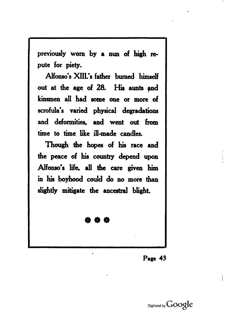 Alfonso’s XIII.‘s father burned himself out at the age of 28. His aunts and kinsmen all had some one or more of scrofula’s varied physical degradations and deformities, and went out from time to time like ill-made candles.
