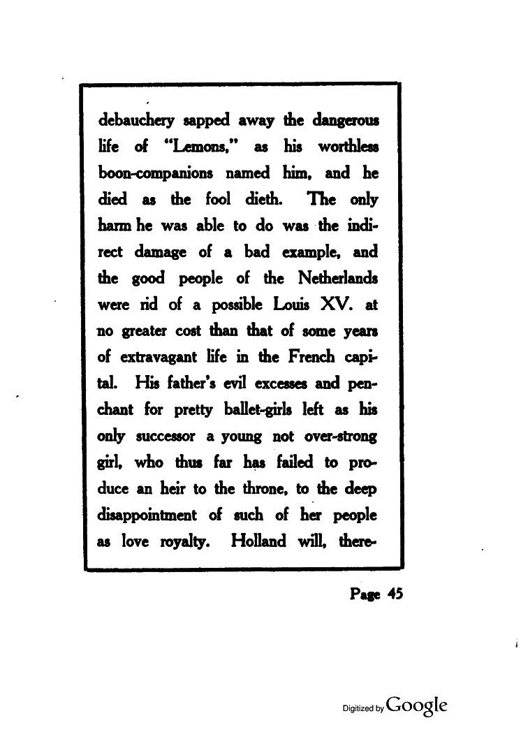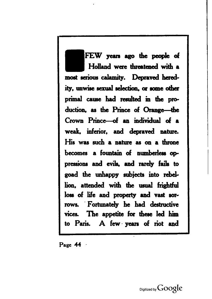 {43} A FEW years ago the people of Holland were threatened with a most serious calamity. Depraved heredity, unwise sexual selection, or some other primal cause had resulted in the production, as the Prince of Orange—the Crown Prince—of an individual of a weak, inferior, and depraved nature. His was such a nature as on a throne becomes a fountain of numberless oppressions and evils, and rarely fails to goad the unhappy subjects into rebellion, attended with the usual frightful loss of life and property and vast sorrows. Fortunately he had destructive vices. The appetite for these led him to Paris. A few years of riot and {44} debauchery sapped away the dangerous life of “Lemons,” as his worthless boon-companions named him, and he died as the fool dieth. The only harm he was able to do was the indirect damage of a bad example, and the good people of the Netherlands were rid of a possible Louis XV. at no greater cost than that of some years of extravagant life in the French capital. His father’s evil excesses and penchant for pretty ballet-girls left as his only successor a young not over-strong girl, who thus far has failed to produce an heir to the throne, to the deep disappointment of such of her people as love royalty. Holland will, therefore, {45} in all probability, glide into a republic without the usual sanguinary convulsions attending such transitions.