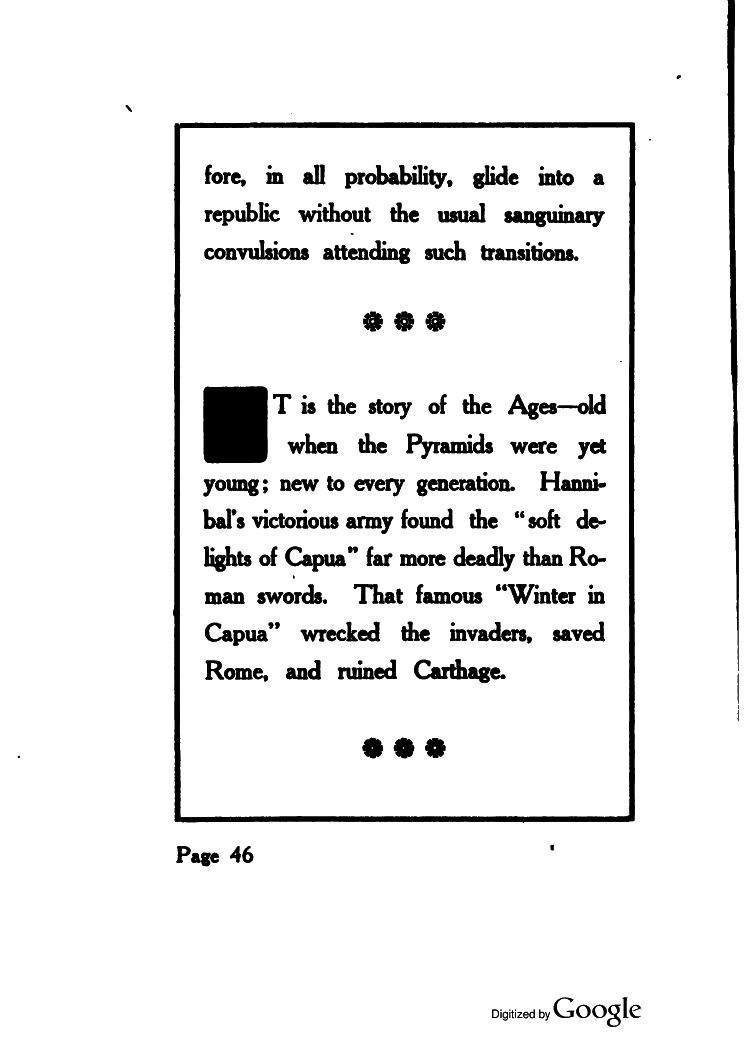 IT is the story of the Ages—old when the Pyramids were yet young; new to every generation. Hannibal’s victorious army found the “soft delights of Capua” far more deadly than Roman swords. That famous “Winter in Capua” wrecked the invaders, saved Rome, and ruined Carthage.