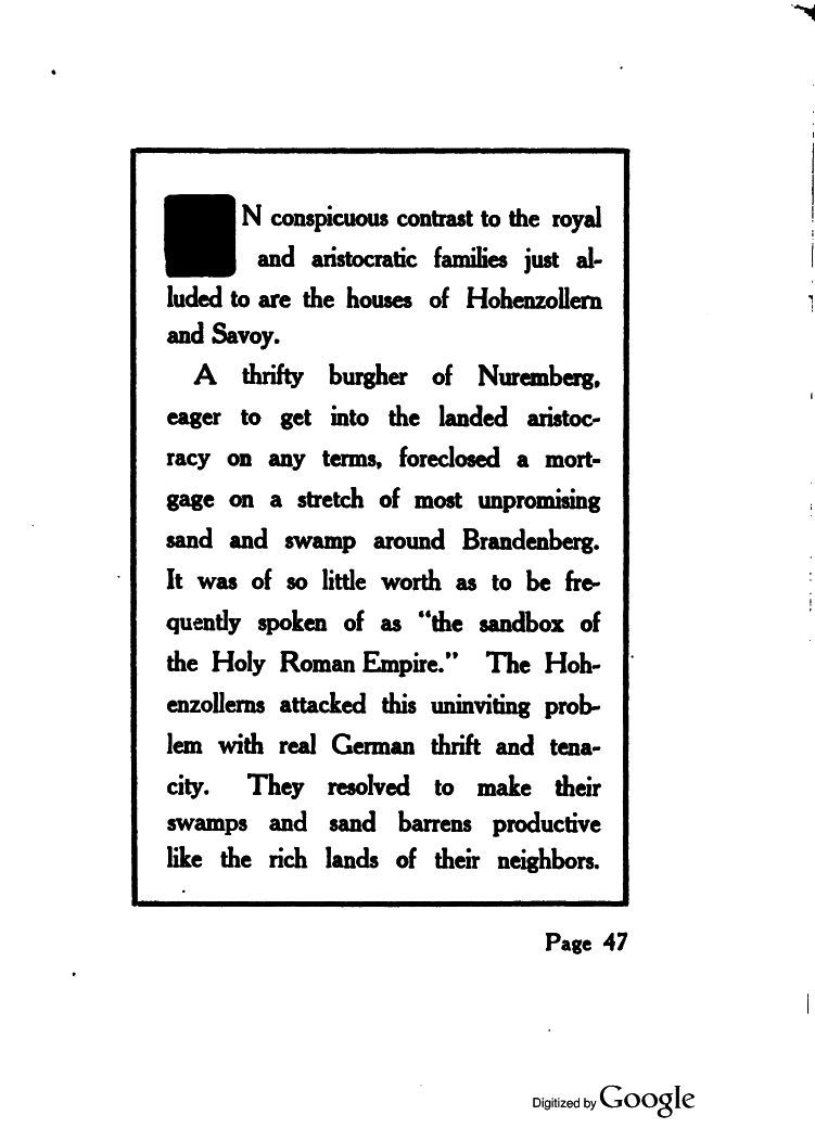 A thrifty burgher of Nuremberg, eager to get into the landed aristocracy on any terms, foreclosed a mortgage on a stretch of most unpromising sand and swamp around Brandenberg. It was of so little worth as to be frequently spoken of as “the sandbox of the Holy Roman Empire,” The Hohenzollerns