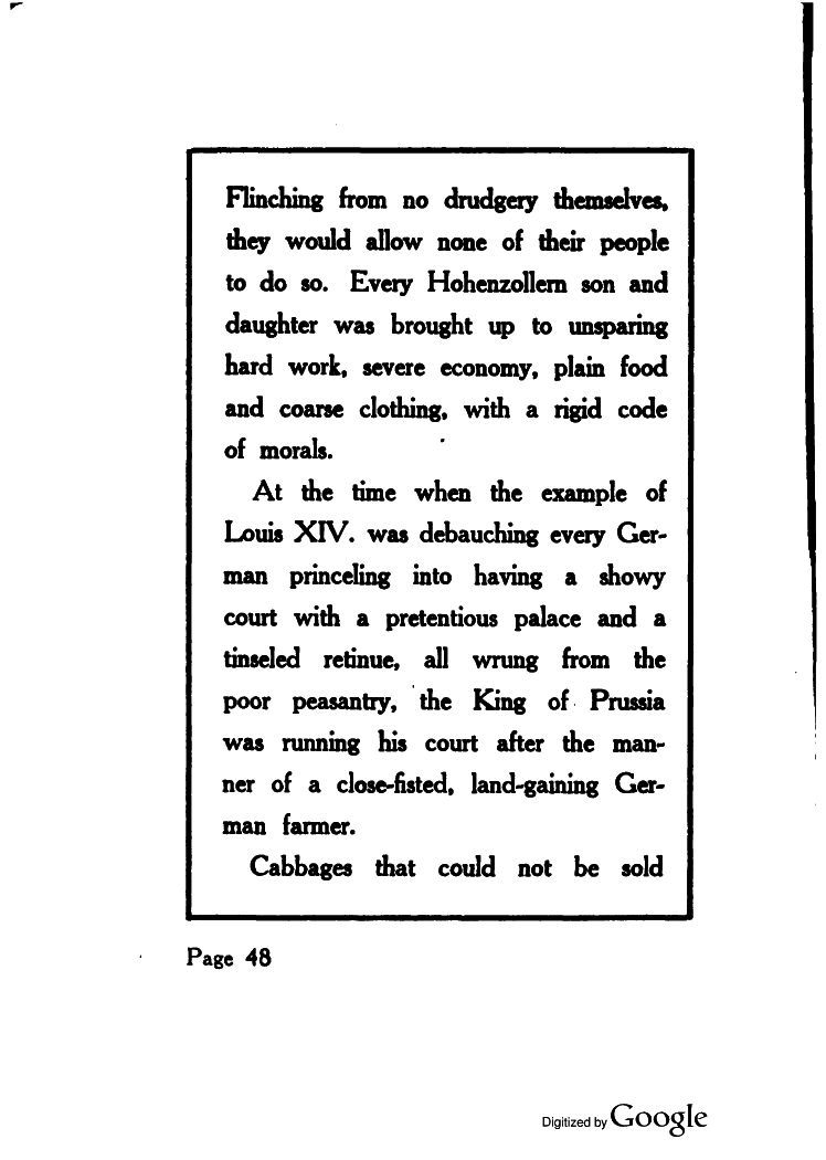 attacked this uninviting problem with real German thrift and tenacity. They resolved to make their swamps and sand barrens productive like the rich lands of their neighbors. {47} Flinching from no drudgery themselves, they would allow none of their people to do so. Every Hohenzollern son and daughter was brought up to unsparing hard work, severe economy, plain food and coarse clothing, with a rigid code of morals.