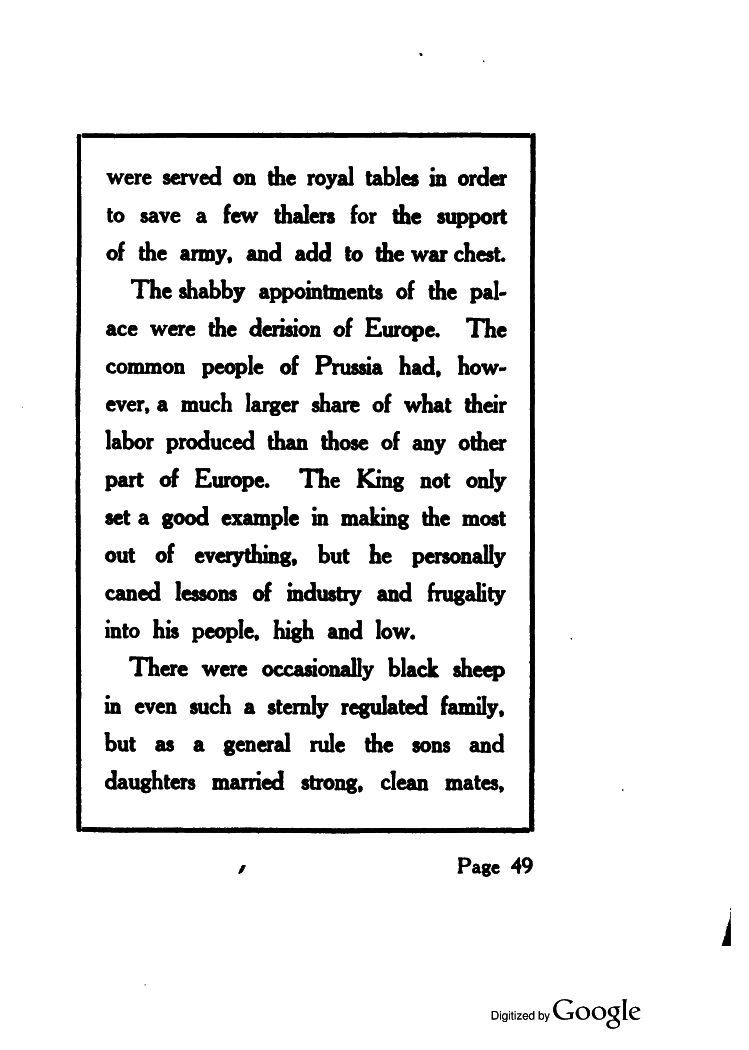 The shabby appointments of the palace were the derision of Europe. The common people of Prussia had, however, a much larger share of what their labor produced than those of any other part of Europe. The King not only set a good example in making the most out of everything, but he personally caned lessons of industry and frugality into his people, high and low.