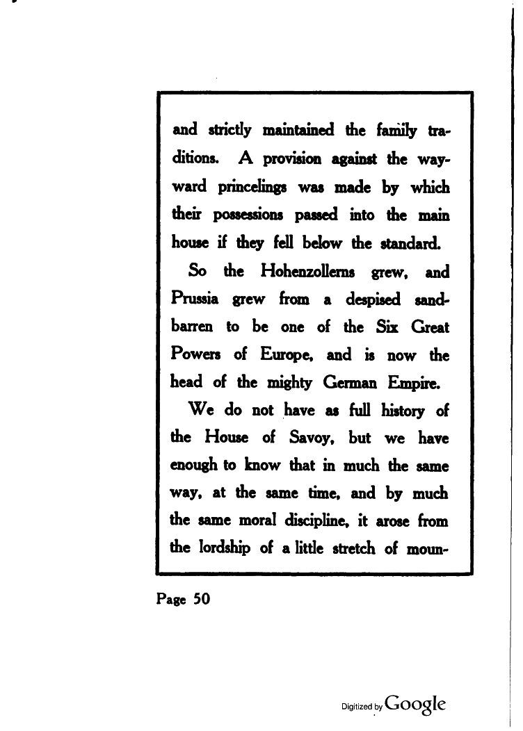 There were occasionally black sheep in even such a sternly regulated family, but as a general rule the sons and daughters married strong, clean mates, {49} and strictly maintained the family traditions. A provision against the way ward princelings was made by which their possessions passed into the main house if they fell below the standard. So the Hohenzollerns grew, and Prussia grew from a despised sandbarren to be one of the Six Great Powers of Europe, and is now the head of the mighty German Empire. We do not have as full history of the House of Savoy, but we have enough to know that in much the same way, at the same time, and by much the same moral discipline, it arose from the lordship of a little stretch of mountain {50} land in the Alps to rule over United Italy.