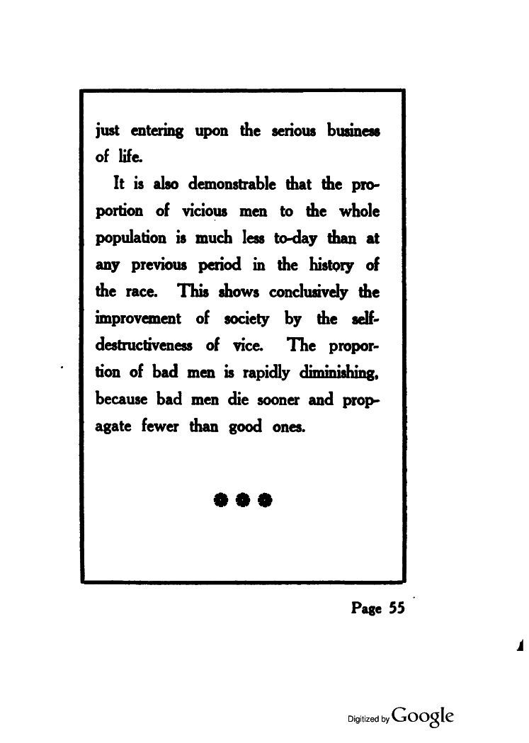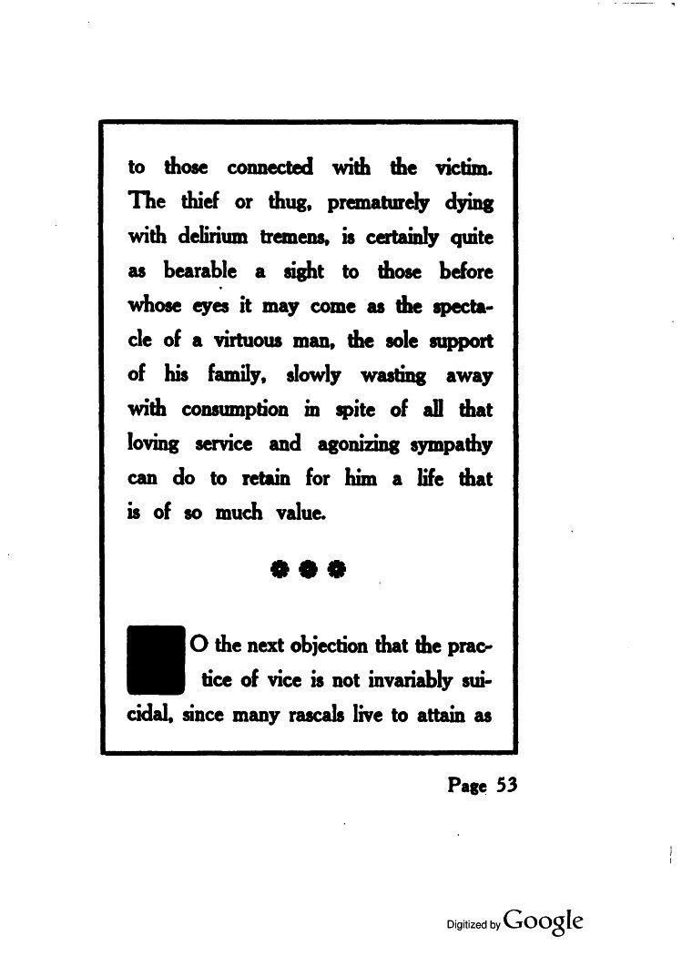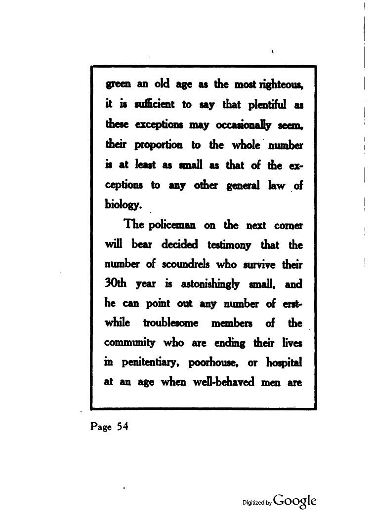 The policeman on the next corner will bear decided testimony that the number of scoundrels who survive their 30th year is astonishingly small, and he can point out any number of erstwhile troublesome members of the community who are ending their lives in penitentiary, poorhouse, or hospital at an age when well-behaved men are {54} just entering upon the serious business of life.