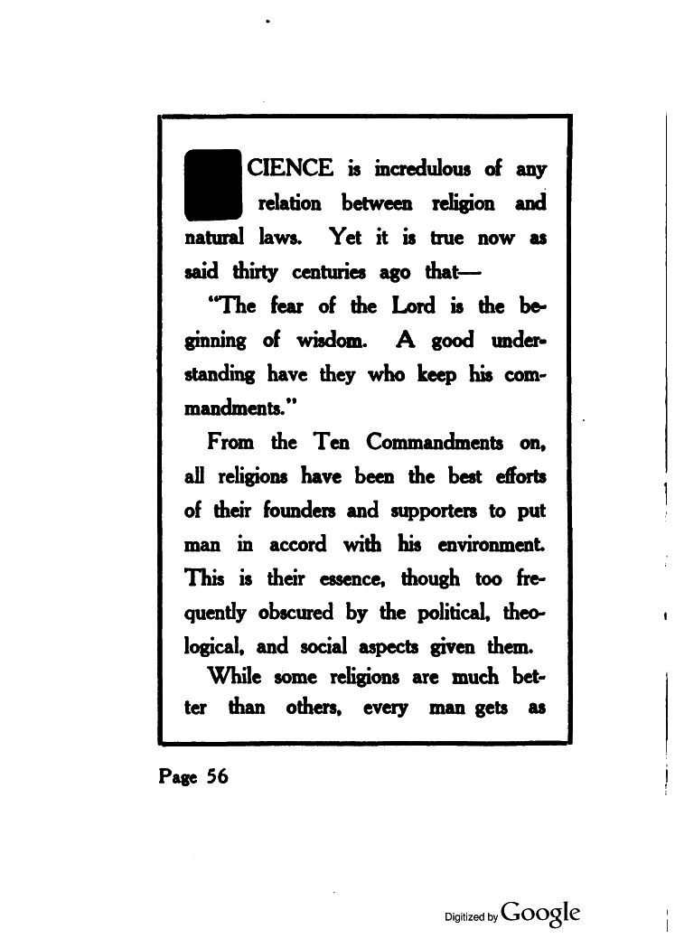 SCIENCE is incredulous of any relation between religion and natural laws. Yet it is true now as said thirty centuries ago that—