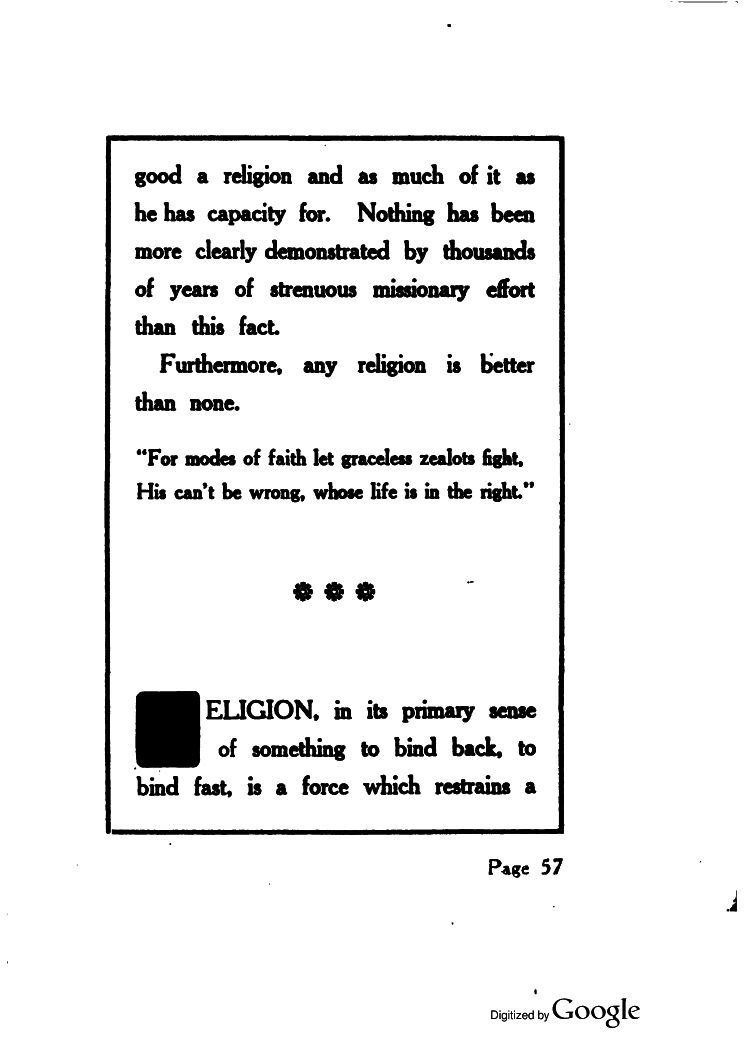 RELIGION, in its primary sense of something to bind back, to bind fast, is a force which restrains a {57} man from acts temporarily attractive but eventually hurtful to himself and others.