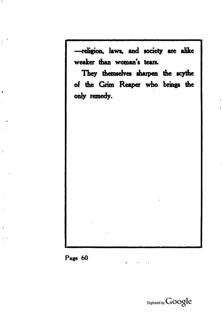But for the hopeless defectives,—the misfits in her tireless productiveness {59} —religion, laws, and society are alike weaker than woman’s tears.