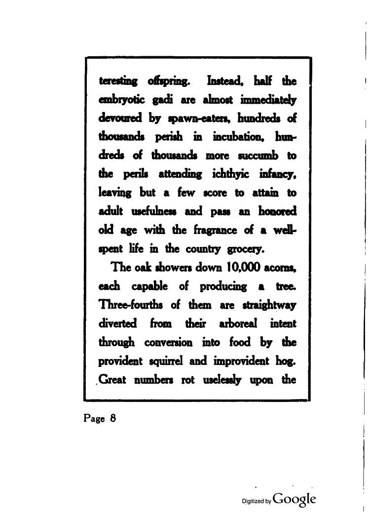 The oak showers down 10,000 acorns, each capable of producing a tree. Three-fourths of them are straightway diverted from their arboreal intent through conversion into food by the provident squirrel and improvident hog. Great numbers rot uselessly upon the {8} ground, and the few hundred that finally succeed in germinating grow up into dense thickets, where at last die strongest smothers out all the rest like an oaken Othello in a harem of quercine Desdemonas.