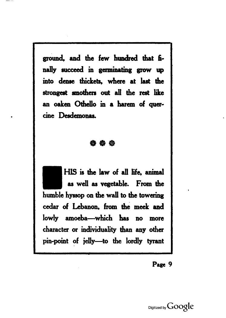 THIS is the law of all life, animal as well as vegetable. From the humble hyssop on the wall to the towering cedar of Lebanon, from the meek and lowly amoeba—which has no more character or individuality than any other pin-point of jelly—to the lordly tyrant {9} man, the rule is inevitable and invariable.