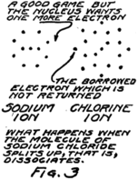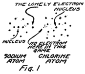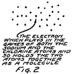 On the whole the electrons hold pretty close to their own circles about their own nuclei. There is always some tendency to run away and play in some other group. With 29 electrons it’s no wonder if sometimes one goes wandering off and finally gets into the game about some other nucleus. Of course, an electron from some other atom may come wandering along and take the place just left vacant, so that nucleus is satisfied.
