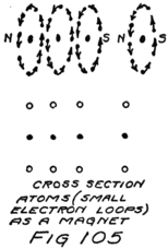 We shall see later what might happen, but first let’s think of an enormous lot of atoms such as there would be in a copper wire. A small copper wire will have in it billions of copper atoms, each with its planetary electrons playing their invisible game about their own nucleus. There is quite a little distance in any atom between the nucleus and any of the electrons for which it is responsible. There is usually a greater distance still between one atomic group and any other.