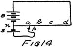 It’s these wandering electrons which are affected when a battery is connected to a copper wire. Every single electron which is away from its home group, and wandering around, is sent scampering along toward the end of the wire which is connected to the positive plate or terminal of the battery and away from the negative plate. That’s what the battery does to them for being away from home; it drives them along the wire. There’s a regular stream or procession of them from the negative end of the wire toward the positive. When we have a stream of electrons like this we say we have a current of electricity.