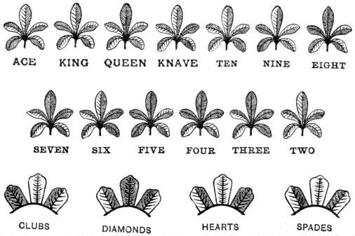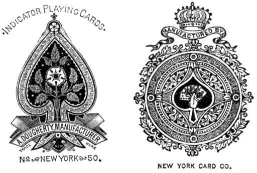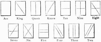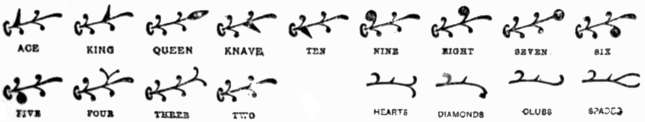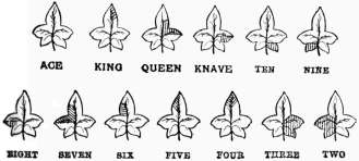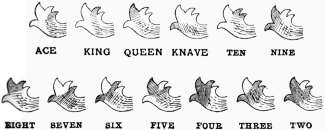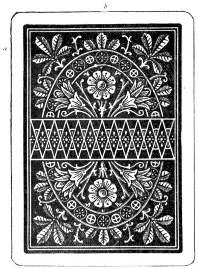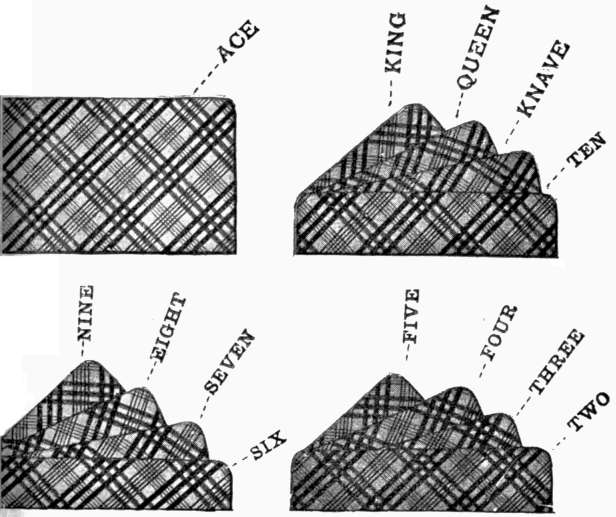 'Directions.—When you part the pack to shuffle press down a trifle and the cards will part to an Ace (the Ace will be on top of the lower part) put that part with the Ace on top and part again to another Ace now shuffle in all but the four top cards, part the cards again to the third Ace and shuffle in all but the top four cards, then put three cards on top of the last Ace (this puts up three Aces with three cards between them and three on top and is for a four handed game) if one more or less than four are playing shuffle in one more or less cards, (always have as many cards between and [305]on top of the Aces as there are players excluding yourself) when the left hand man deals and offers the cards to you to cut you can shuffle them up in the same way (but you must put "one less" card on top of the three Aces to get the Aces yourself)'
