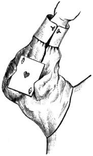 4 Even the modern sharp sometimes uses a method quite as simple. He will put the cards he wishes to hold out under his knee-joint, and when he requires to use them, he will hitch his chair closer to the table, taking the cards into his hand as he does so. This device is called in France the 'coup de cuisse.'