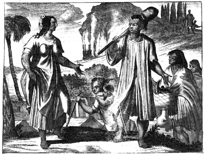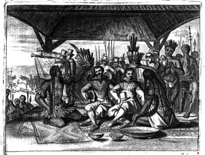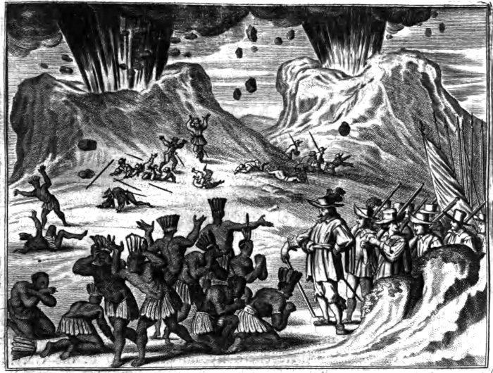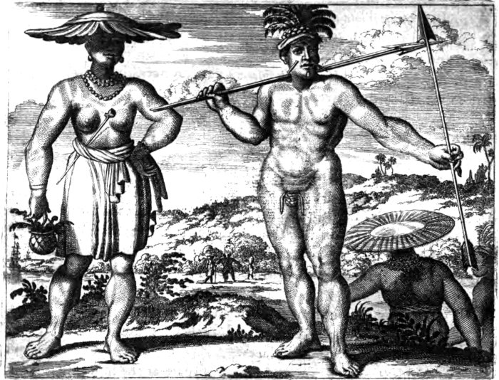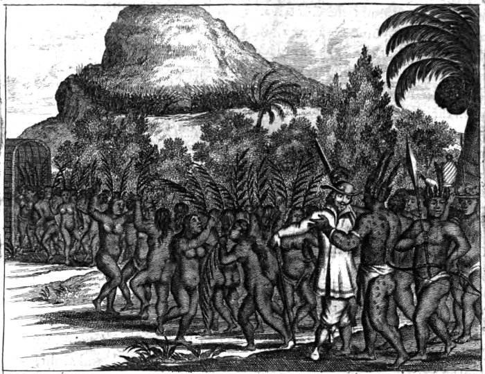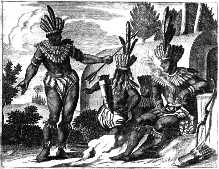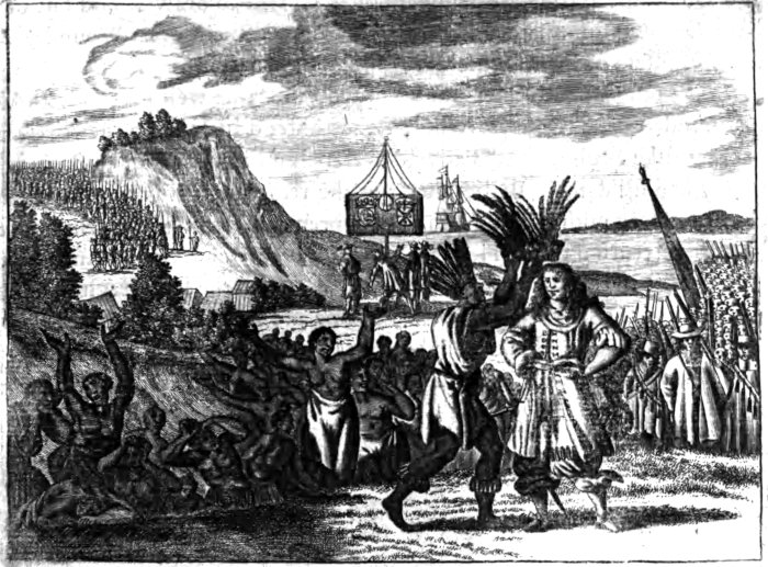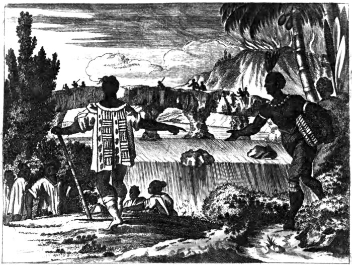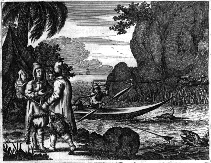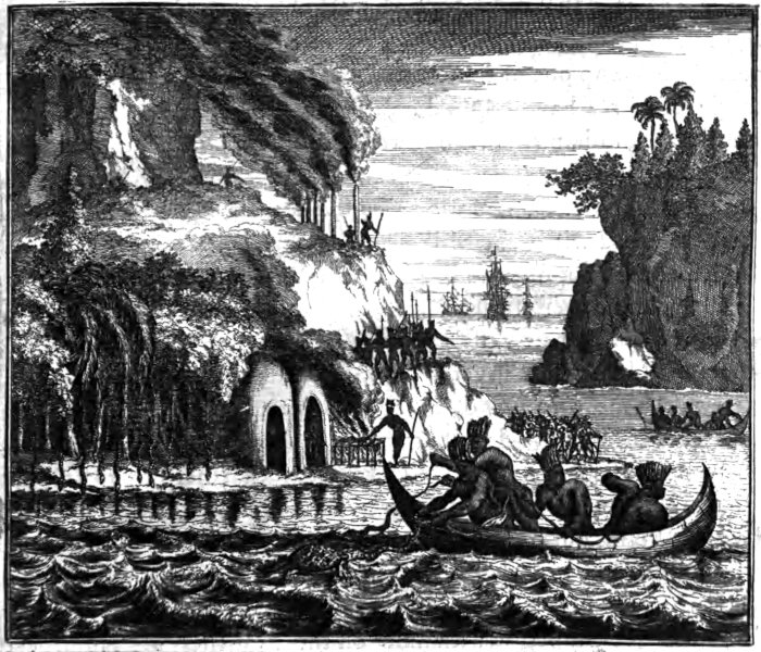 Tasman weighing Anchor, Sail’d between New Guinee and the Island Insou, having got nothing but a few Jamnean words from the Islanders, who call’d a Bone, Vertilia; a Hog, Paro; a Knife, Sapera; Beads, Sassera; a Nail, Tortor; Sleep, Moeni; and a Rat, Asphoo. So steering his Course along Arimoa, which is both higher and larger than the neighboring Amoa, and resembles a Seaman’s Cap, he left New Guinee a Stern of him, and Steering on Northerly, Sail’d by Schoutes-Island, where eight large Boats came within Gun-shot of him, each of which had on each side a Wing, under which sat four Rowers, two and two together, with their Feet hanging in the Water; at their approaching near the Ship they put out a long Pole, with a white Flag upon it; whereupon Tasman also commanded his white Ensign to be put forth, and threw a String of Beads, ty’d to a piece of Wood, out of his Cabbin Window; which the Southlanders had no sooner taken up, but in testimony of thankfulness they all broke their Arrows over their Heads, and kept near the sides of the Ship, till such time as the Boatswain thereof sounded a Trumpet, upon the hearing of which they all Row’d away with as much speed as they could possibly. These People were of a sallow Complexion; they broke their Arrows with great Ceremony; for first they pointed with them towards the Skie, then put them into the Water, and breaking each Arrow in two pieces on their Heads, they threw one over the Larboard, and the other over the Starboard; he that broke the Arrow, made a long Speech to the Hollanders, who took the same for an Oath of their Fidelity toward them. In every one of these Boats were twenty eight or thirty Men.