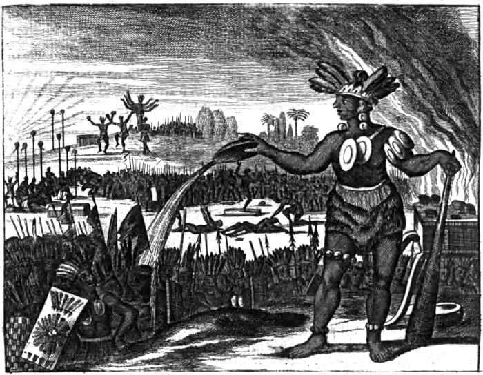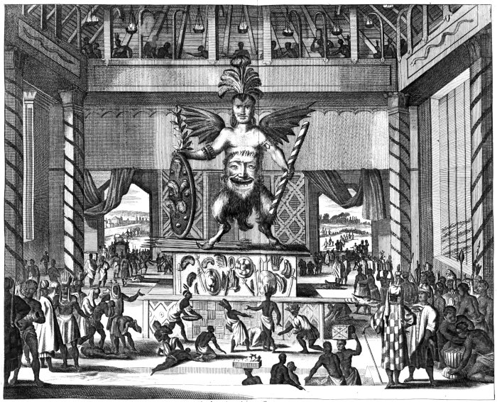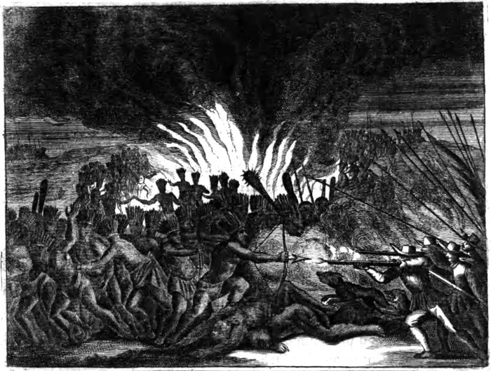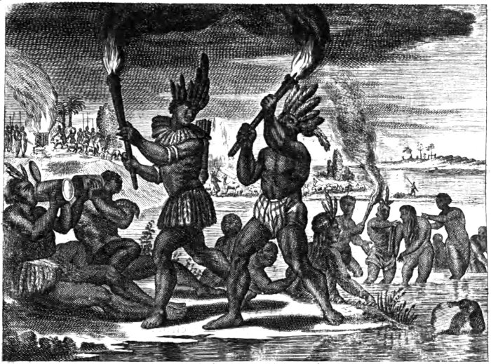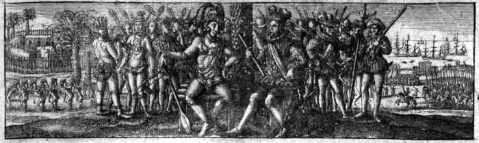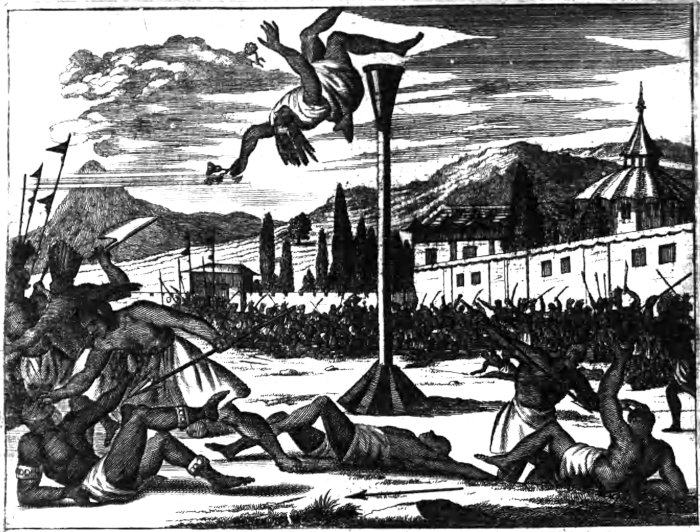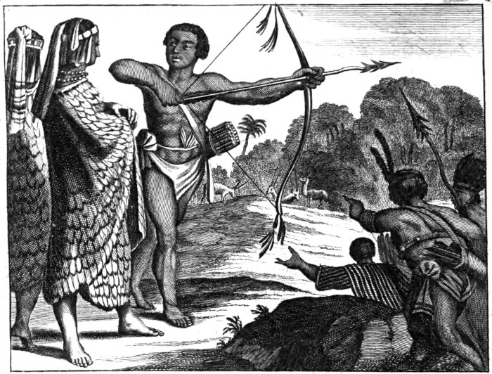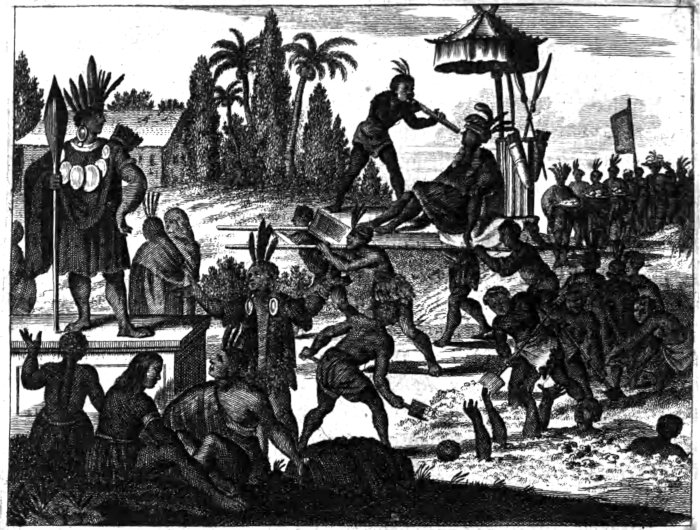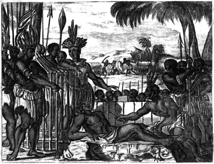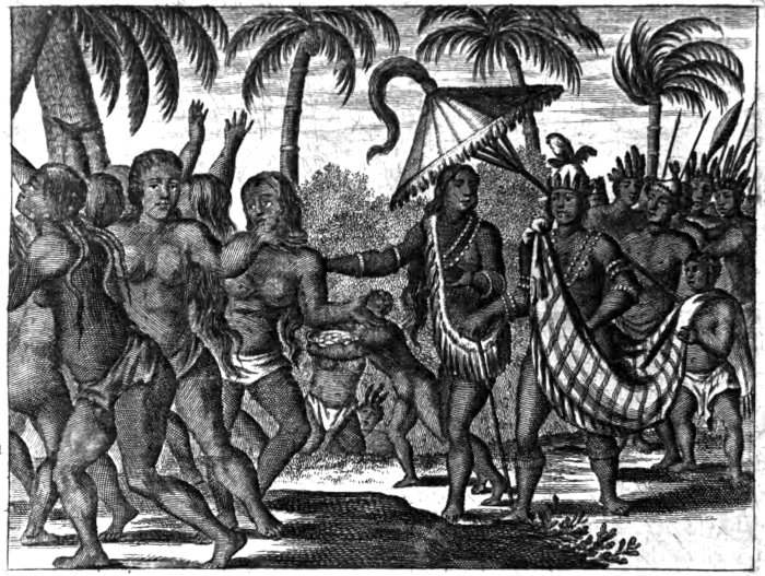 Tasman weighing Anchor, Sail’d between New Guinee and the Island Insou, having got nothing but a few Jamnean words from the Islanders, who call’d a Bone, Vertilia; a Hog, Paro; a Knife, Sapera; Beads, Sassera; a Nail, Tortor; Sleep, Moeni; and a Rat, Asphoo. So steering his Course along Arimoa, which is both higher and larger than the neighboring Amoa, and resembles a Seaman’s Cap, he left New Guinee a Stern of him, and Steering on Northerly, Sail’d by Schoutes-Island, where eight large Boats came within Gun-shot of him, each of which had on each side a Wing, under which sat four Rowers, two and two together, with their Feet hanging in the Water; at their approaching near the Ship they put out a long Pole, with a white Flag upon it; whereupon Tasman also commanded his white Ensign to be put forth, and threw a String of Beads, ty’d to a piece of Wood, out of his Cabbin Window; which the Southlanders had no sooner taken up, but in testimony of thankfulness they all broke their Arrows over their Heads, and kept near the sides of the Ship, till such time as the Boatswain thereof sounded a Trumpet, upon the hearing of which they all Row’d away with as much speed as they could possibly. These People were of a sallow Complexion; they broke their Arrows with great Ceremony; for first they pointed with them towards the Skie, then put them into the Water, and breaking each Arrow in two pieces on their Heads, they threw one over the Larboard, and the other over the Starboard; he that broke the Arrow, made a long Speech to the Hollanders, who took the same for an Oath of their Fidelity toward them. In every one of these Boats were twenty eight or thirty Men.