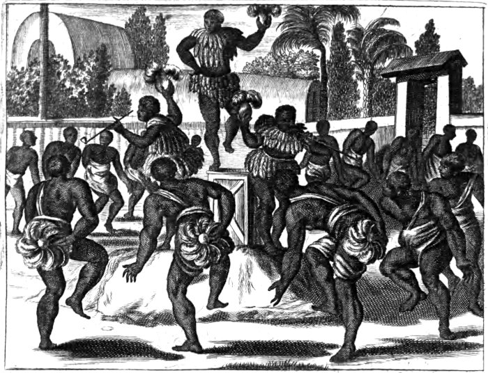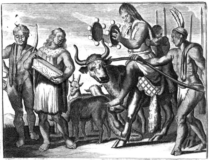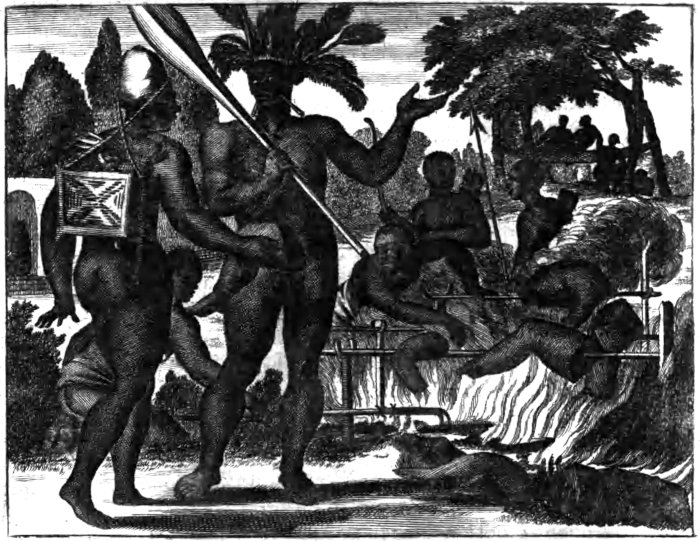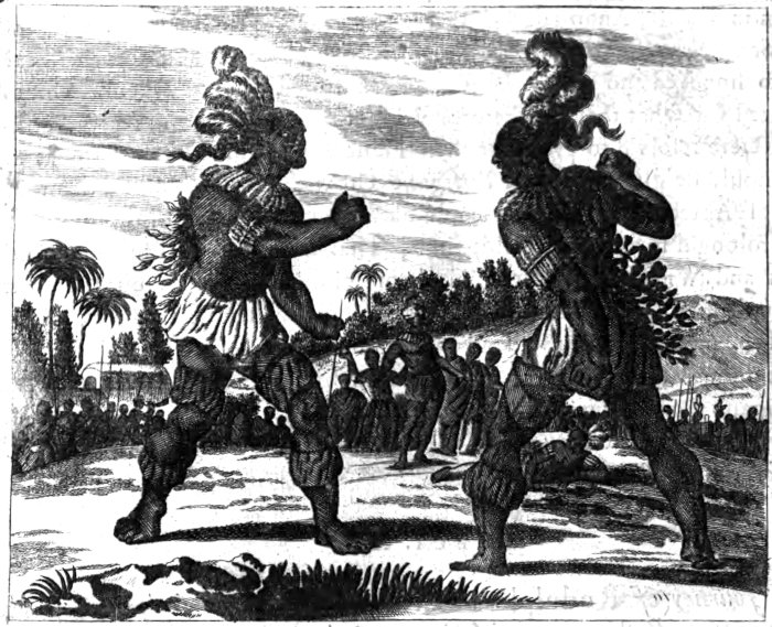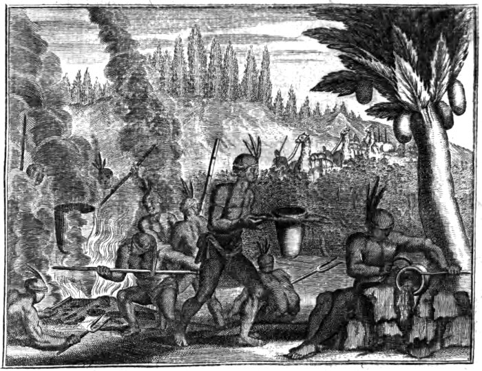 Tasman Sailing on along the Main Coast, met with eighteen Boats more, the Rowers whereof laid their Oars upon their Heads, and not without strange Gestures call’d aloud, and invited the Hollanders to come ashore: On the Sterns and Heads of these Boats were likewise divers Shapes Painted, upon a white Ground; in some were two, and in others three, four, and five Men; eight of them going into the Hollanders Boats, were made Drunk with Arrack. These Southlanders went stark naked, some onely covering their secret Parts with Leaves; their Skins were black, onely on their Foreheads they drew a red Stroke, which reach’d to their Ears; their brown curl’d Hair was by some colour’d grey, by some red, some let it hang loose over their Sholdiers, others ty’d the same in a Tuft on their Crown, cover’d with a Cap of Pisang Leaves, others wore their Hair scarce two Fingers long, and through the Gristle of their Nose, a piece of Cane or Quill, and a broad Beard without Mustacho’s; they had nothing to barter but large Snail-shells, on which they made a strange noise; and whatsoe’re they receiv’d, they first smell’d on it like Dogs: they fancy’d not Nails, as all the other Southlanders had done. Their manner of Fishing was thus: They ty’d several half Clappes-shells, made fast like a Chain, to a long Reed, shook the same to and again on the Water, to gather the Fish together. In the Boats lay Planks of an oval fashion, which by Ropes ty’d in the middle they held before them in stead of Shields. When these Southlanders went from the Ships, one of them threatned to beat the Seamen, shaking his great Club at them; whereupon they all Row’d with great speed to the Shore, whilest one in every Boat knockt with a Staff against the sides, just as if they had beat an Alarm. Amongst them one had barter’d for an old Doublet, with which he shew’d many antick Tricks, putting it on the wrong way, sometimes on his Head, then his Feet into the two Arm-holes, and anon the Button-holes behind on his Back.