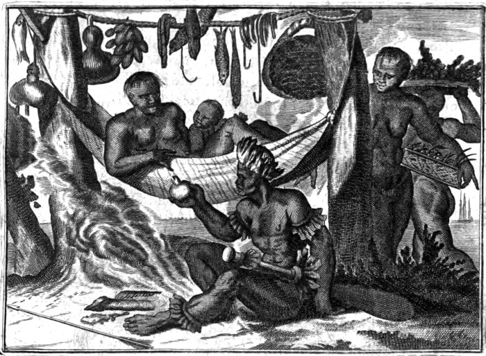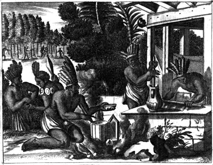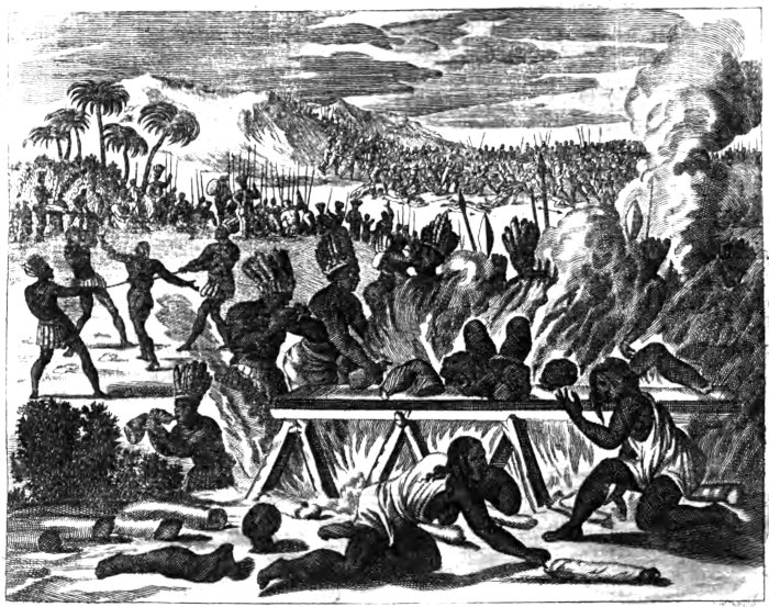 The fore-mention’d Haelbos relates, That going ashore with some Soldiers, he saw their Houses, which he found to be built after a strange manner, viz. some of them were round like Towers, Wider at top than at bottom, and without any Holes for Air, but all built close of Canes, which were stuck in the Ground; other 657Huts were cover’d with a long Roof of Pisang or Clappes Leaves, resting on Posts; under which kind of Building Haelbos shelter’d himself against a mighty Shower of Rain, found divers young Men and Women sitting on Mats, and an old Woman, blind through Age, lying by them on the Ground, and Fanning her self with Pisang Leaves: The Men going away, signifi’d thereby a kind of Invitation to the Hollanders to go to the Women, who not receiving the Entertainment they expected, rose altogether on a sudden, and Singing, Danc’d about the Hollanders. The Men had on their Shoulders and Breasts, Scars of half an Inch deep, and an Inch long; upon some of which, being fresh and bleeding, the Flyes sat. They eat after a strange manner, for stripping off the outmost Rinds of the Clappes with their Teeth, and breaking the hard Shell against their Elbows, they pull out the Kernel, and eat the same. Whatever Flesh-meat they eat, they never throughly boyl or roast it, but make it onely just warm. They sleep on the Ground upon Mats, and lay their Heads on a little woodden Cricket with four Feet. They take great pride in their Hair, and those that have not long Hair of their own, use Perukes.